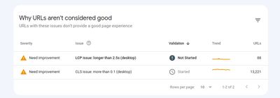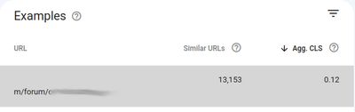Search Console is a little different. Instead of looking at overall page views, it looks at problems by the number of URLs, giving all of them the same weight. In this case, the CLS scores were at an average of 0.12 for a specific URL pattern, slightly higher than the 0.1 that would merit a score of good for CLS.